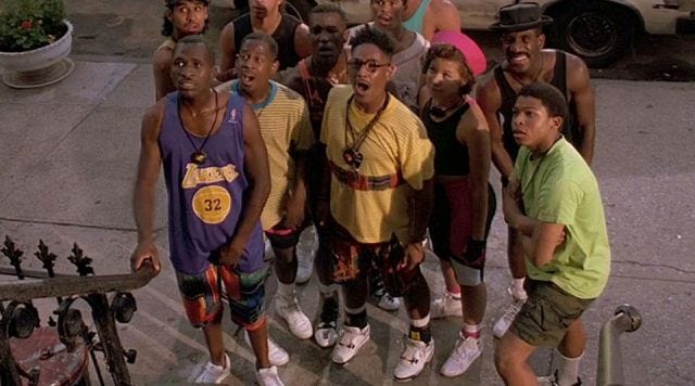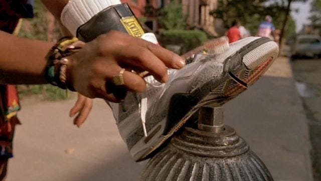 One of Do the Right Thing’s most memorable moments comes from a scene in which Buggin’ Out (played by Giancarlo Esposito) confronts a stranger for stepping on his pristine Air Jordan 4s. Lee was the first to bring the rules and etiquette of sneaker culture to the big screen, giving mainstream audiences a look into a growing subculture that was rooted in Black American life. The offending character, the singular white neighbor on the block, represented white privilege, the effects of gentrification, and a (familiar to many) disrespect for the existing community’s culture.