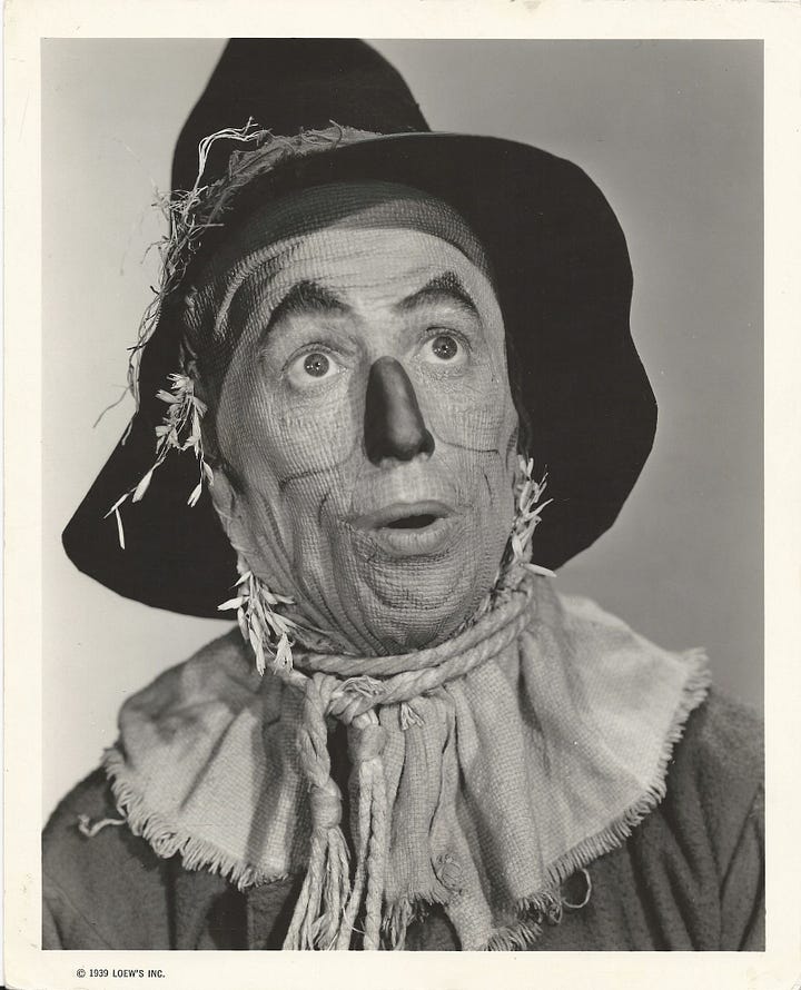 Makeup artist Jack Dawson pioneered a technique using foam latex to create the masks worn by the Scarecrow and Cowardly Lion. According to Aljean Harmetz 1989 book The Making of The Wizard of Oz, it took a full hour to slowly peel the glued-on mask from the Scarecrow’s face. The masks were disposed of each day, with over 100 Scarecrow masks being used over the course of filming. Actor Ray Bolger was left with permanent scars around his mouth and chin from the role.
