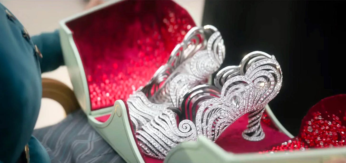 The new hit musical movie series Wicked opted for Baum’s original silver. Though the crystal shoes in the new movies are eye-catching in their own right, the color may not have been entirely by choice. Warner Bros owns the copyright for The Wizard of Oz, which includes the ruby slippers, and recreating them too closely for Wicked could have landed Universal in legal trouble. The contemporary silver shoes, designed by Wicked costume designer Paul Tazewell, feature a tornado-like spiral motif hand-jeweled with 1,165 Preciosa crystals.