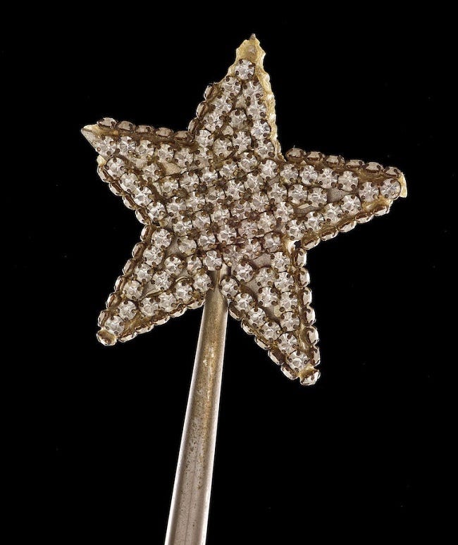 The fate of Glinda’s gown remains unknown, and no versions of her crown have ever been accounted for. One version of Glinda’s wand has been displayed in multiple museum collections before selling for $400,000 at auction; the rhinestone prop was verified to have appeared in test shoots, but was not the same wand that was shown on screen.