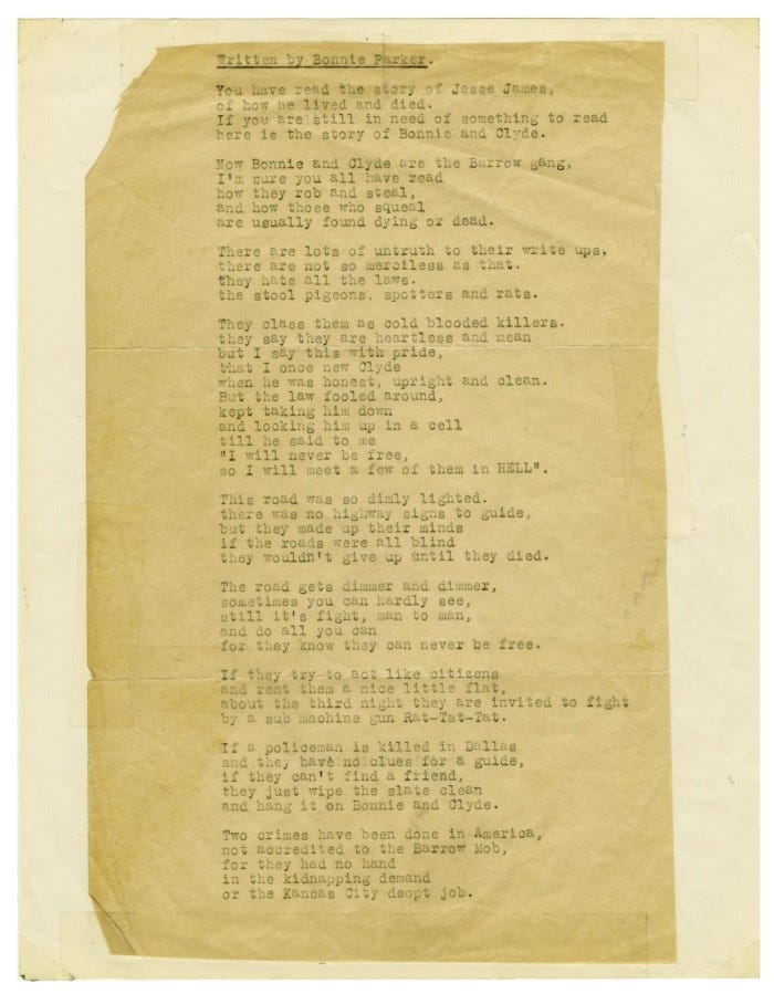 Amongst a large arsenal of abandoned weapons were Buck’s three-week-old parole papers, a handwritten poem by Parker, and several undeveloped rolls of film. The photos were developed at The Joplin Globe, revealing numerous shots of the young fugitives posing with guns and cigars. The dramatic staging indicated that the photos were exaggerated for the crew’s own entertainment, but the striking images catapulted them to instant stardom. Several publicity photos for the 1967 movie were almost shot-for-shot recreations of the titillating originals.