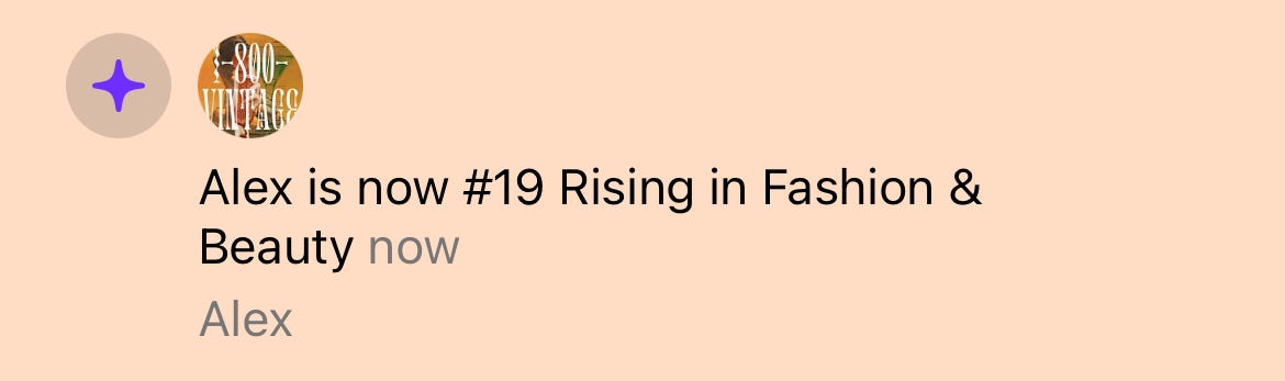 I got vulnerable on Instagram and asked for support in this career shift, and holy shit you guys showed UP for me. Your encouragement won me my highest spot yet on the Substack Rising charts in Fashion & Beauty, and I’m feeling more confident than ever that I’m exactly where I need to be.