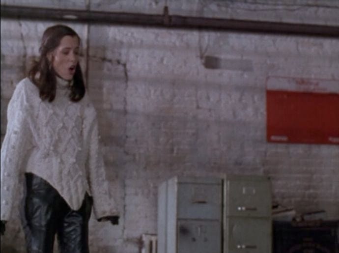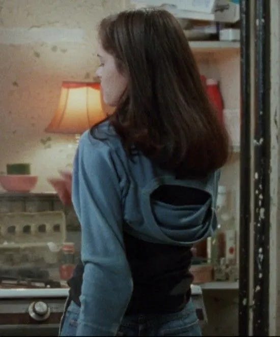 One of the most brilliant styling choices in Party Girl is how Mary is often dressed in things worn the “wrong” way. In one scene, she wears the sleeves on a sweatshirt like a bolero (you can see the head hole at her back when she turns around).