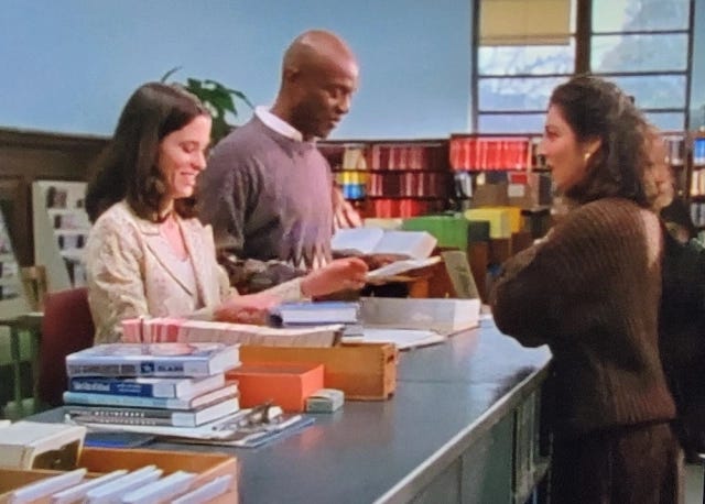 A Chanel couture jacket was borrowed from the collection of Vogue’s Hamish Bowles for the delivery of a single, iconic line - “Hello, Chanel!” - while a vintage suit came from Posey’s own closet. “It was a vintage cream 70’s suit that I wore in the library, I remember,” she told The Cut. “Brocade! I like to bring my own wardrobe or shop for my character.”