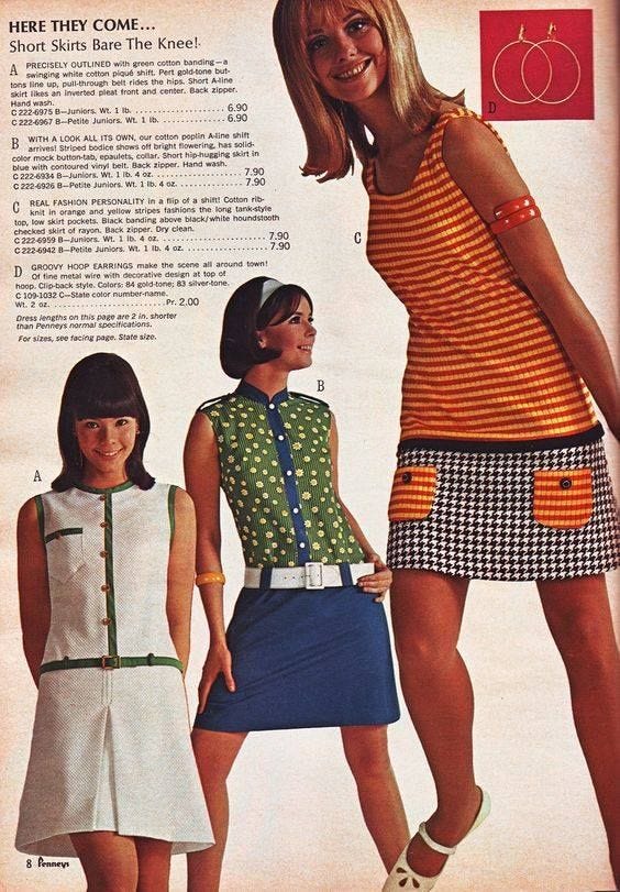 So who were eye-catching, fashionable clothes made for then? Oftentimes, they were specifically and only for young people. The further back in time you go, the more that gender roles and societal expectations played a role in what kind of clothing was manufactured for who. Most styles that would be considered super trendy were made for and marketed to the youth because fashion was seen as frivolous and immature. More revealing clothing was typically limited only to younger women, as it would be seen as inappropriate for an “older” woman or (god forbid) a mom to look too hot. Even today, many fashion trends are considered “for the kids.” Younger people are more likely to experiment with their wardrobes, to try new things, and to seek out forms of unique self expression through clothing.