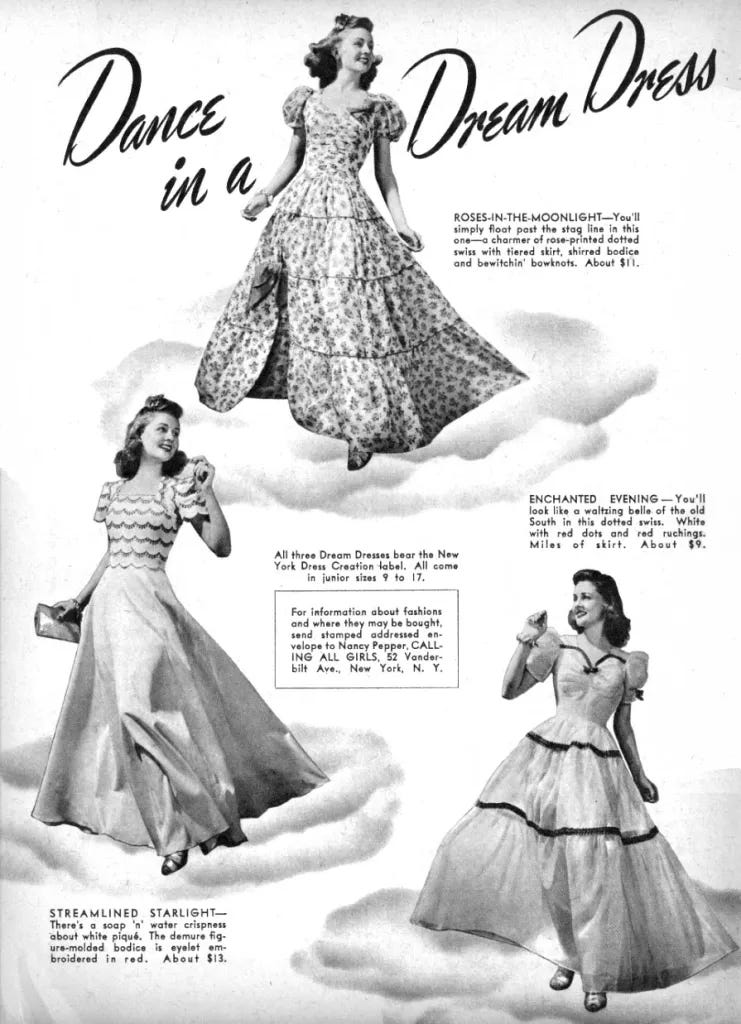 Much of the lovely, beautiful vintage formal wear that we see sold today was once worn at high school dances, sweet sixteens, or at weddings where the couple, the bridal party, and many of the guests in attendance were likely in their mid 20’s or younger. In the 1950’s, the median age for a first marriage in America was 22, and even by the 90’s the median age was only around 26-27. Like most of us, I don’t wear the same size at 32 that I did at 22, or even at 26. And there’s a good chance that I’ll be a different size by 42, 52, and onward.