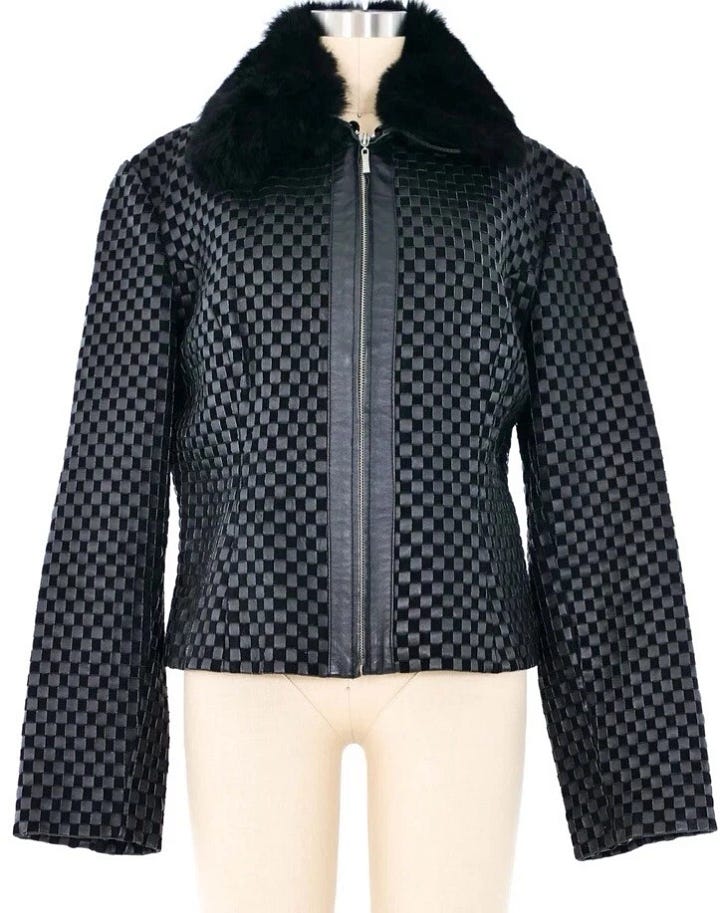 Black intrecciato leather jacket w/ detachable fur collar, Size 3X, $99