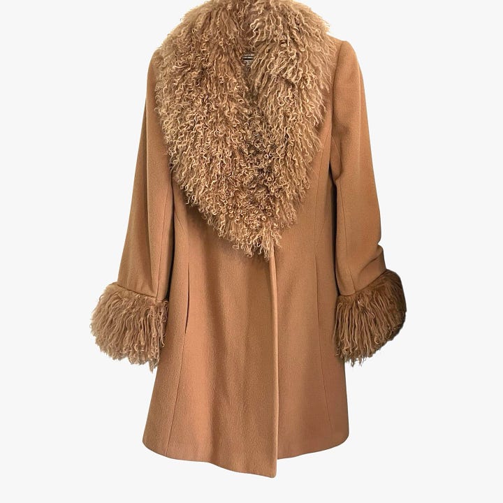 Not a trench, but couldn’t resist including two more great coats. This leather is an enchanting shade of brown, and I love a zip-out liner - Size L, $60. This plush faux fur is so sweet and whimsical, a classic black faux fur with a twist - Size 12, $64.35